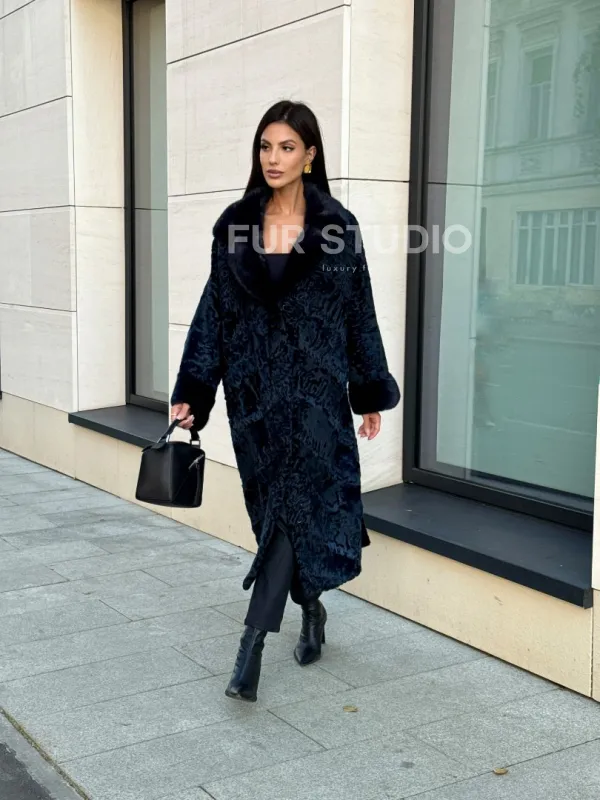 Шуба из каракуля Indigo Blue с отделкой из меха норки, фасон кокон 101105