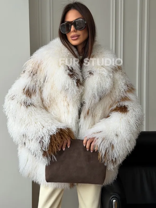 Шуба из ламы бело-коричневая 102550